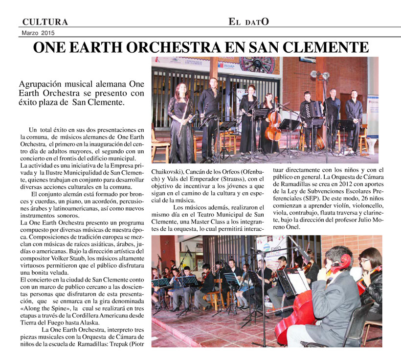 “In Zusammenarbeit mit dem internationalen Programm zum biokulturellen Schutz der Subantarktis, der Gemeindeverwaltung Cabo de Hornos und dem Donald McIntyre Griffiths Gymnasium, gab das One Earth Orchestra Instrumentalkurse für die Schüler der Bildungseinrichtung. .... Im abendlichen Konzert erklang verschiedenste Musik unserer Zeit, die in europäischen, asiatischen, amerikanischen arabischen und jüdischen Traditionen wurzelt. Die Melodien der Blas- und Streichinstrumente, von Klavier und Akkordeon, sowie die virtuosen Rhythmen verschiedener Perkussionsinstrumente begeisterten das Publikum aus vielen Schülern, Lehrern und anderen Musikinteressierten. ... Das beispiellose Konzert unter der künstlerischen Leitung des Komponisten Volker Staub gab der Öffentlichkeit einen Einblick in eine faszinierende Welt der Klänge.”