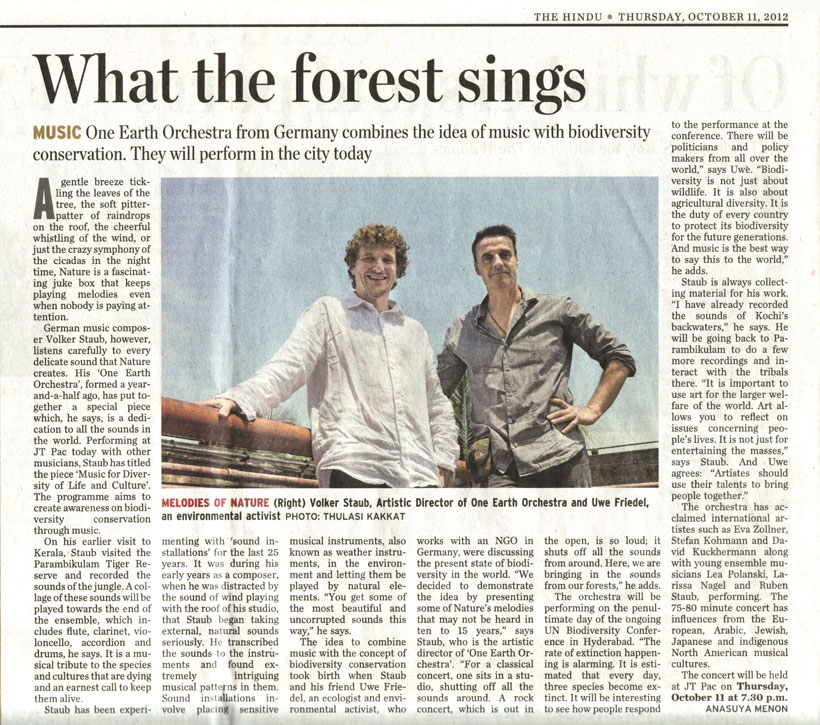 "Das Konzert des One Earth Orchestra war ein künstlerischer Beitrag auf der Biodiversitätskonferenz der Vereinten Nationen (COP 11) am 18. Oktober. .... Mit einem Programm aus europäischer, arabischer, indischer, japanischer und nordamerikanischer Musik verschiedener Epochen, mit Klangcollagen und "Witterungsinstrumenten", die von Umweltkräften gespielt werden, zeigten die Musiker des OEO eine begeisternde Auswahl der Musik und Klänge unserer Erde. .... Die Musik der Menschheit ist so vielfältig und entstammt doch einem gemeinsamen Kern, wie die sternförmigen Prismastrahlen eines Kristalls, betonen die Musiker. .... Das Programm zeigt eindringlich die enge Verbindung und gegenseitige Abhängigkeit von kultureller und biologischer Lebensvielfalt."